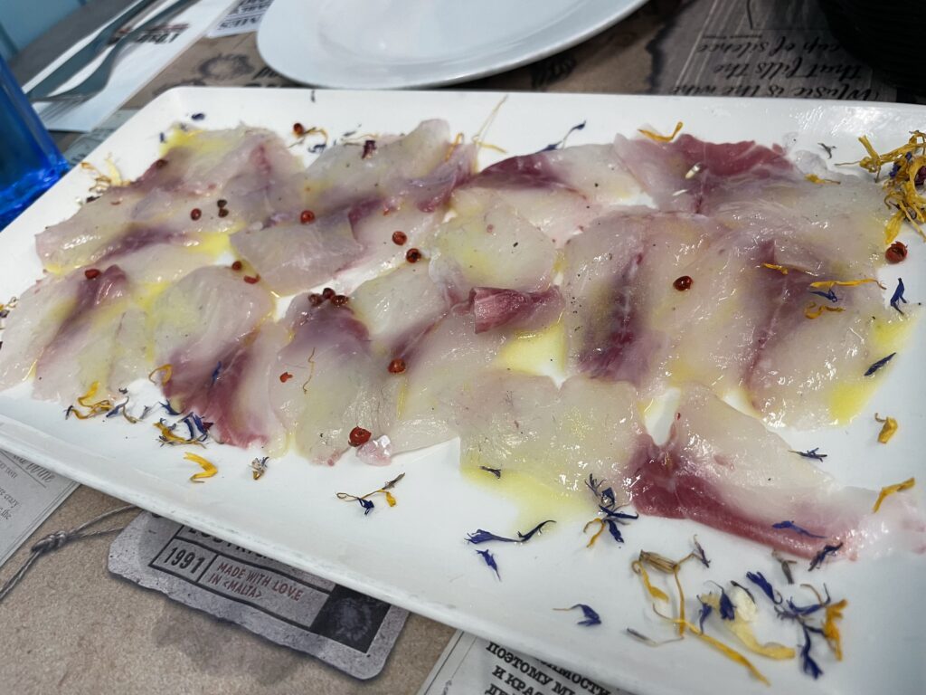 特にカルパッチョが絶品!島国ならではの鮮度の良さで、身が締まってプリプリの歯応え。爽やかなソースにレッドペッパーの実が彩りと刺激を添え、絶妙な味わいでした。